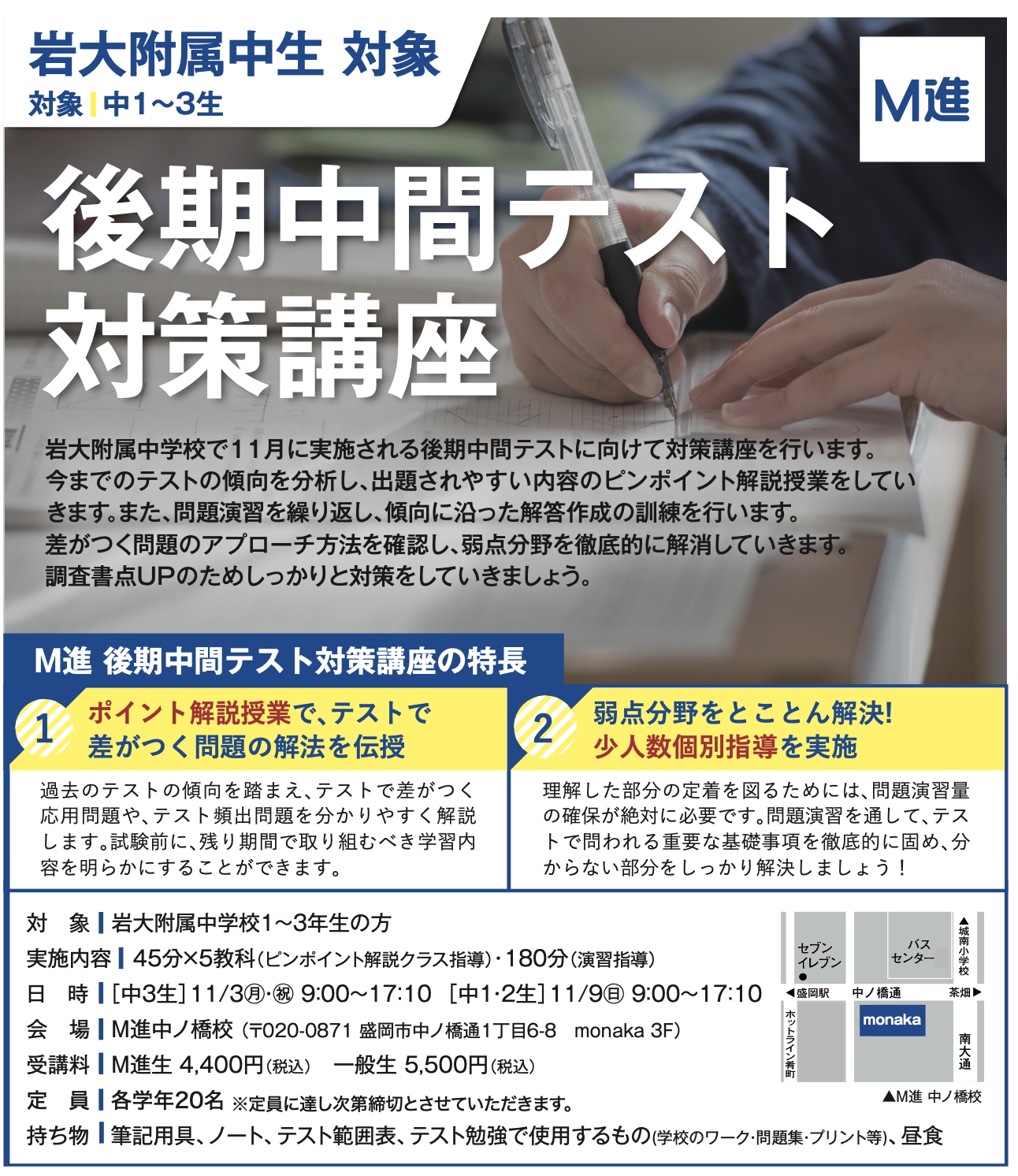 岩大附属中学校で11/14・17(中3生)11/21(中1・2生)に実施される前期期末テストに向けて対策講座を行います。