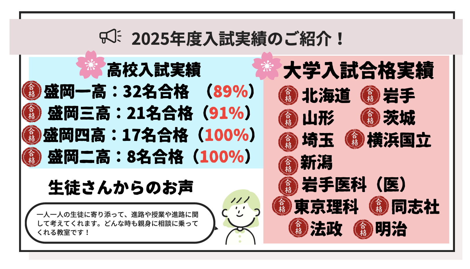 2025年度高校入試実績は、盛岡第一高等学校32名(合格率91.4%)、盛岡第三高等学校 22名(合格率95.7%)、盛岡第四高等学校18名(合格率100%)と多数の生徒さんが第一志望校の合格を勝ち取ってくださいました!!女性の先生も多数在籍しており、皆さんの目標や課題に合わせて自分のペースで学んでいきたい生徒さんもご安心してお通いいただくことができます。
