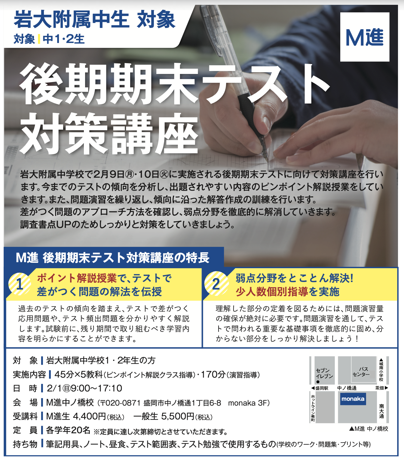 岩大附属中学校で2/9(月)・10(火)に実施される前期期末テストに向けて対策講座を行います。